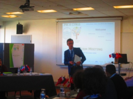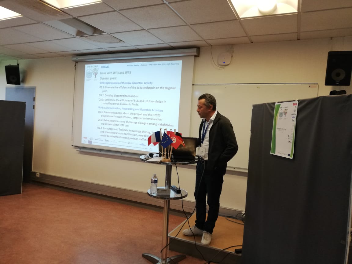 Project Mid Term Meeting IPM-4-Citrus MTM has taken place on 29th and 30th November 2018 at INSA (Salle des theses, Toulouse, France) in pleasant and open exchange atmosphere with dense discussion. All consortium partners (11 partners represented by ERs and ESRs, head of INSA and LISBP, INSA administrative staff) were present in addition to our PO (SPANIER Tiphanie) and Innovation & Transfer expert (M. Baldwin BERGUES). MTM was divided in 2 ½ days, one to present the administrative and scientific progress of the project (review of indicators for each WP) and the second one to exchange and evaluate (i) secondments realisation and (ii) innovation opportunities. Both ½ days ended with a conclusive part and a listing of actions to undertake or to improve.